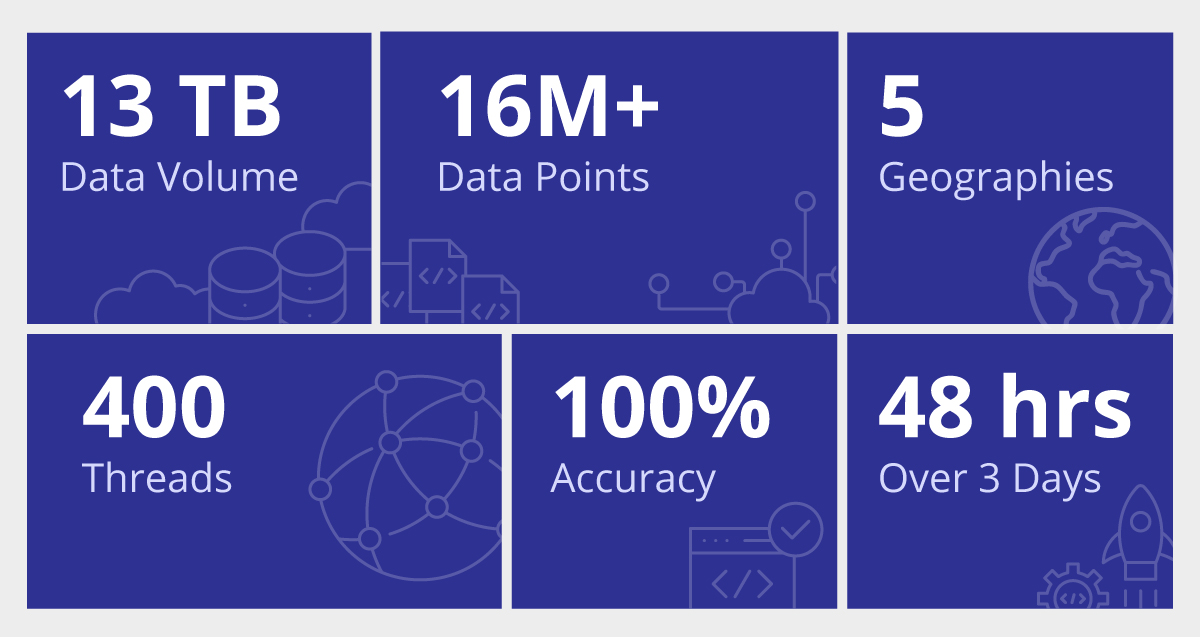For achieving the project’s target velocity, eQube®-DaaS Platform automatically scaled to meet the data volume. At its peak, 400+ threads were running concurrently on the cluster, seamlessly migrating data in the hybrid environment.